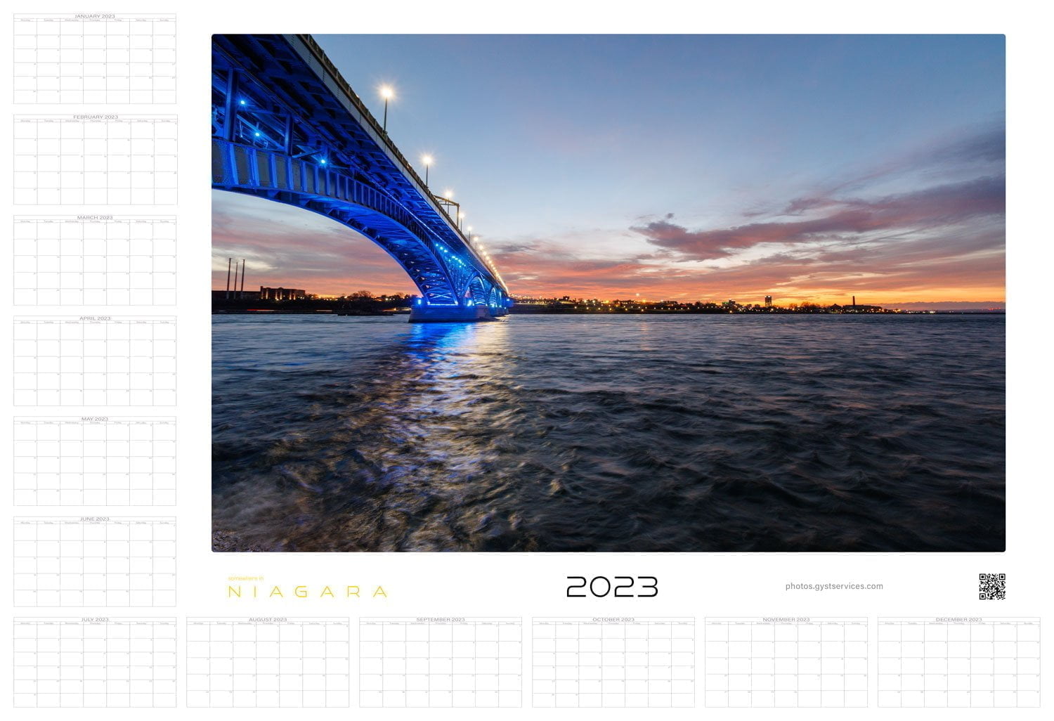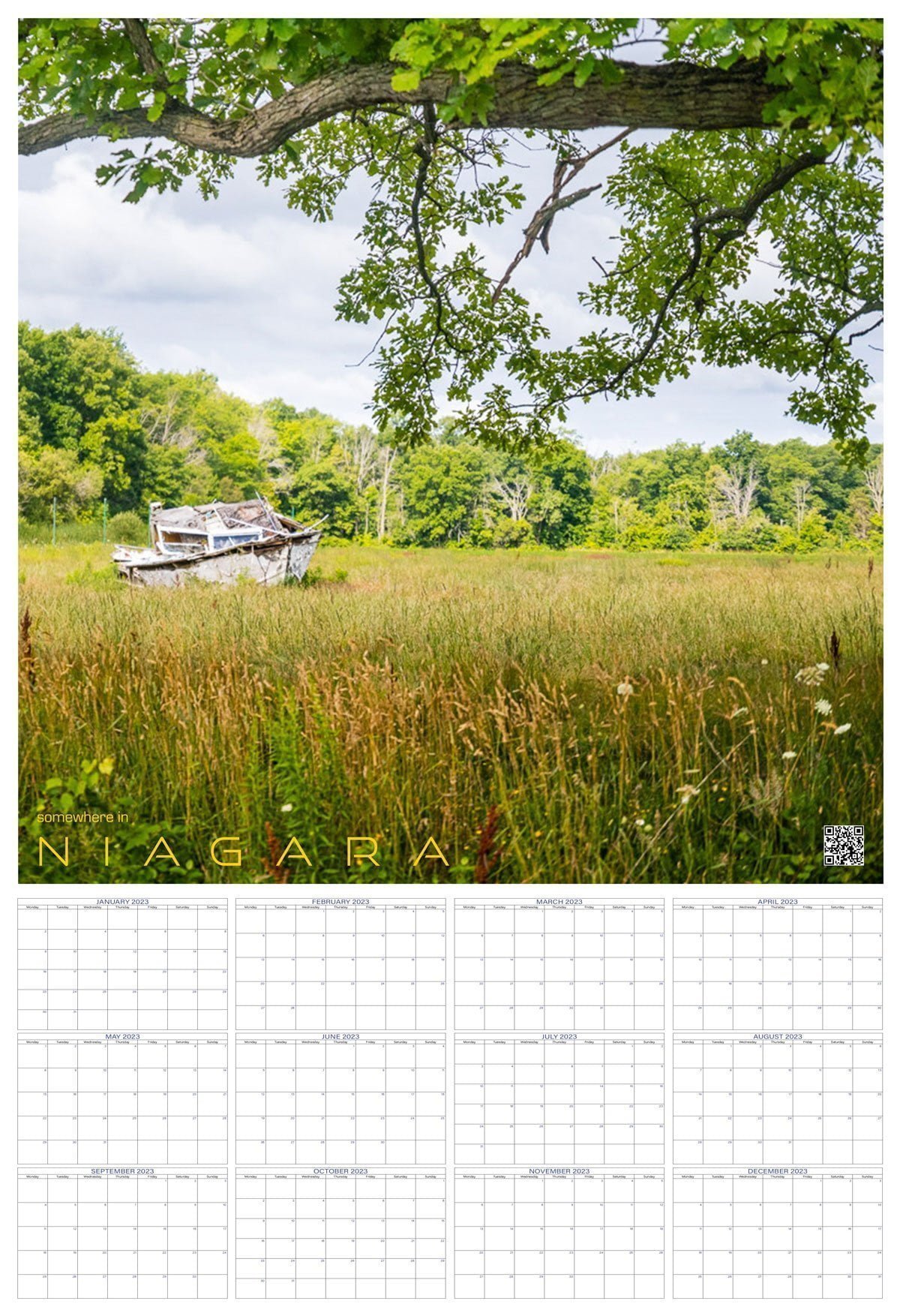 Both layouts are full year formats which focus on a single image. YOU choose the image. ANY image from our Somewhere In Niagara selection. Or any from our social channels. So the world is your oyster. Assuming you live in Niagara. Curbside pickup is available in Port Colborne, or delivery throughout the Niagara region for a flat $10 fee. Delivery beyond Niagara is, sadly, not currently an option. If enough are sold, that may change…